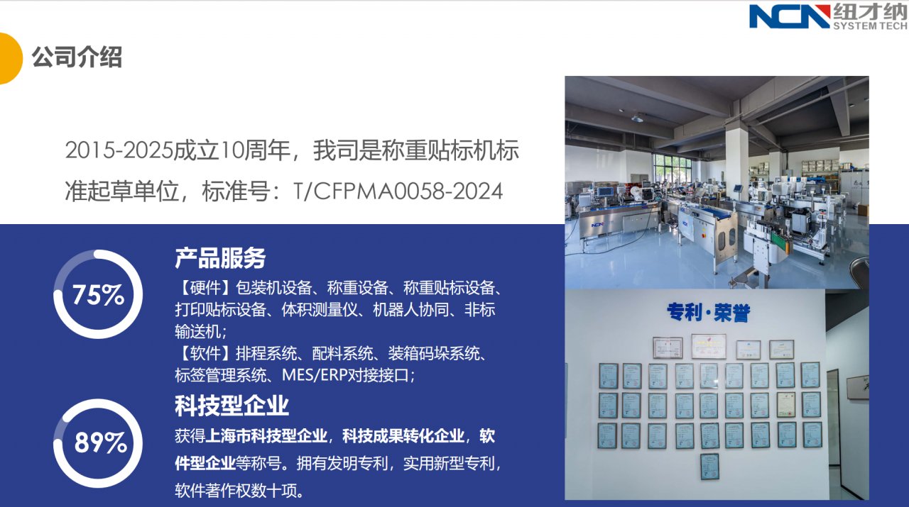 公司成立2015年公司成立,致力于自动化行业后端包装解决方案!2016年第一款自主研发的称重贴标一体机上市销售!专注食品行业!2017年公司参加FIC.PROPAK,CEMET等国际展会,展会产品会的一直好评!并于SATO达成战略合作伙伴协议。2018年公司第二代产品问世。主要服务于食品及生鲜配送行业!并获得上海市科技型企业!2019年公司获的高新技术成果转化企业!与正大集团,绝味食品等企业达成合作协议:2020年获得高新技术企业!软件型企业!专利数突破20件。