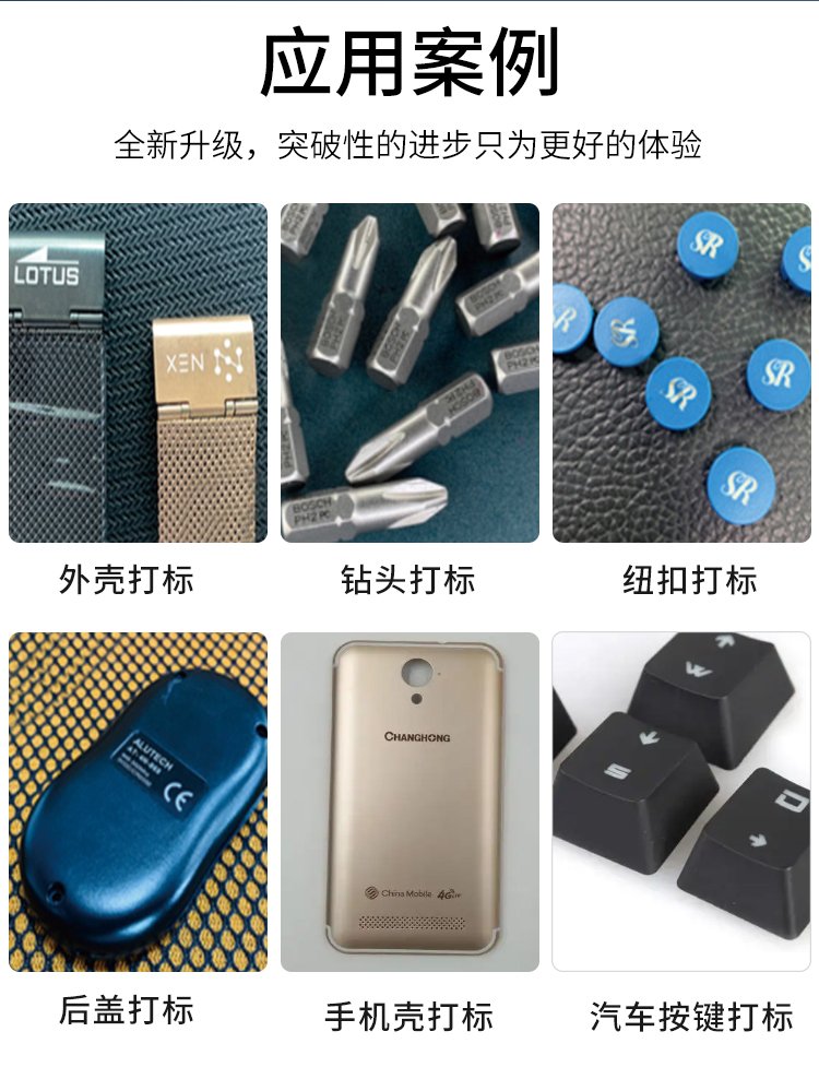 广泛应用与USB外壳、U盘、手机壳、手机后盖、汽车按键、地铁票、钻头、纽扣等领域的高精度、自动化打标、适用于工作量大、供料定位难,工件多样性及复杂性等场合。